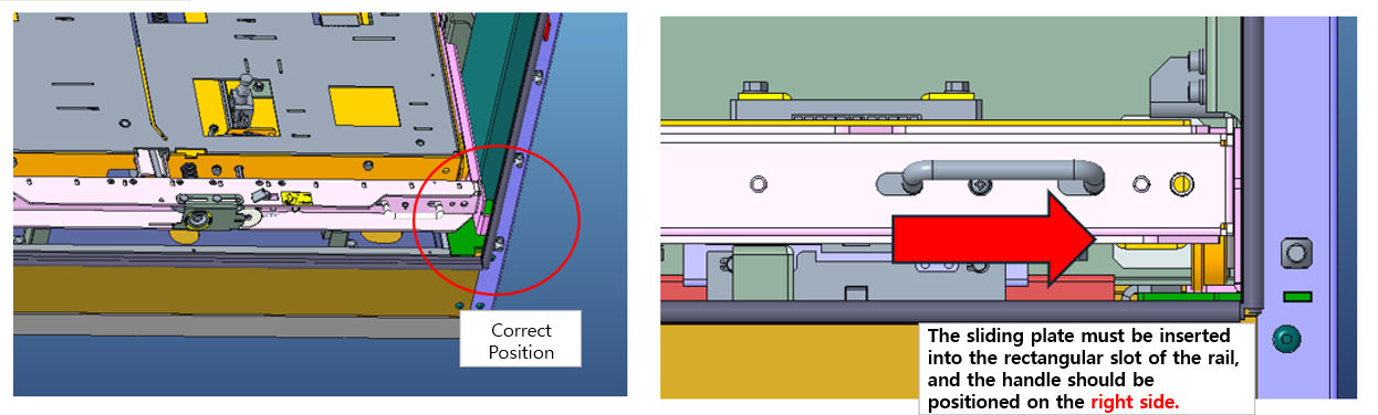 As observed in the field and shown in the reference image, the Sliding Plate on the right-side girder was not properly inserted into the rectangular rail slot.
