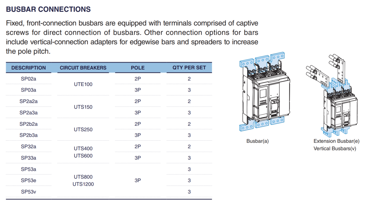For UTS800 and UTS1200 breakers, busbar connections are provided through front-access terminals with captive screws, allowing for direct and secure connection of busbars.
